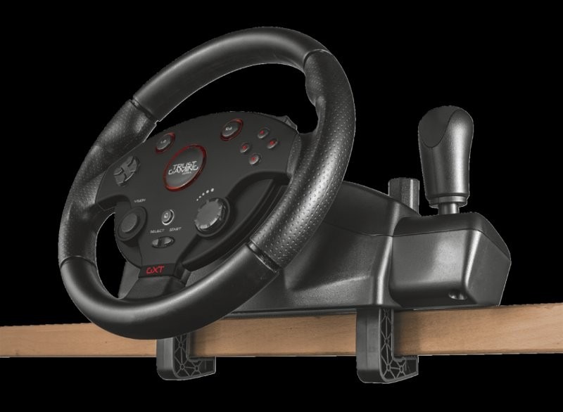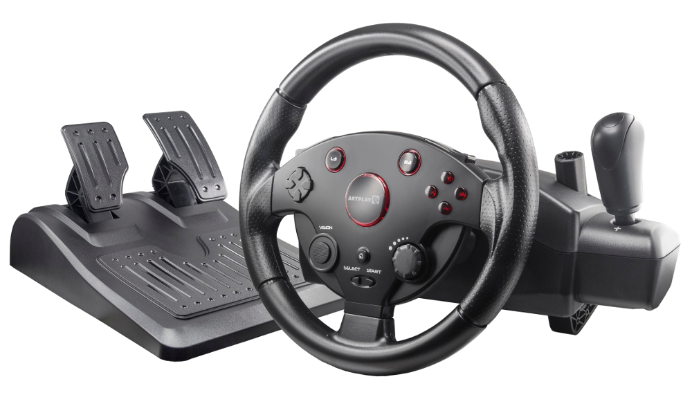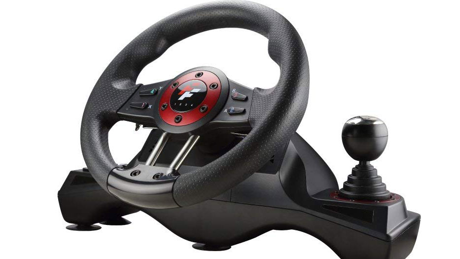Relatively low price (5000-7000 rubles) with ample opportunities. The rubberized wheel with a diameter of 24.5 cm and a rotation angle of 270 degrees is connected to a personal PC or Sony Playstation 3 via a USB cable. Vibration is provided for realistic sensations, there is a unit with a gearbox and an additional one with a brake / gas. There is a strong fixation during the game, no looseness, easy setup and a demonstration of responsiveness.