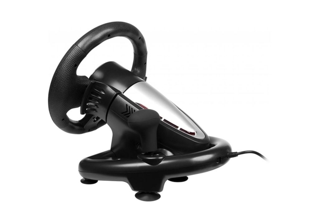 In the store, the product can be purchased for 3850 rubles. The steering wheel is wired. It is considered the most worthy in the budget segment. The device is connected to a PC using a USB connector. The steering wheel is attached to the tabletop with special suction cups. The diameter of the device is 28 cm, and the angle of rotation is 1800.