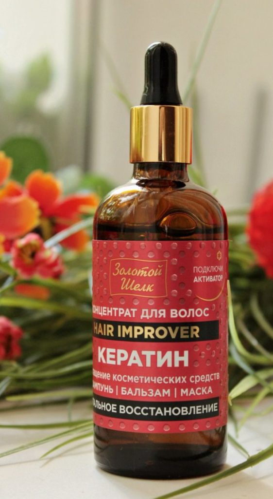 The concentrate with keratin extract will be the perfect complement to any shampoo or balm. The concentrate penetrates deeply into the hair column and restores damaged areas.Thanks to this product, the hair is restored in a short time, becomes shiny and smooth. The split ends are glued together. Users note that during combing, hair loss is reduced.