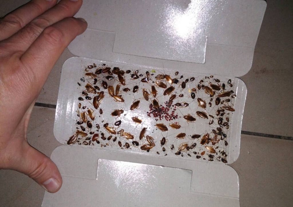 The most effective and at the same time the most poisonous devices belong to this category. They work on the principle of a chain reaction. Placed in the center of a small box, poison exuding a pleasant smell for parasites attracts them to itself. Through the holes located on each side, provide free access to cockroaches to it. Having tried a little “delicacy”, each of the pests transfers its particle to their relatives, thus infecting everyone in its path. A potent poison does not give any chance of survival. Such products must be handled with extreme caution and the basic rules for working with pesticides must be observed: