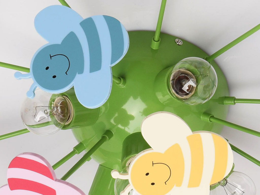 The design of the lighting device is based on metal. The plafonds are made of glass. The color scheme is very pleasant and pleasing to the eye. Decorative elements of the lamp are made in the form of bees.The maximum total power of the bulbs that can be installed in the luminaire is 200 watts. This will create the most comfortable level of lighting in a bedroom up to 10 square meters. meters. Initially, the product is intended for lighting a children's room. But it can be used in other areas as well. The only downside is the lack of bulbs in the kit.
