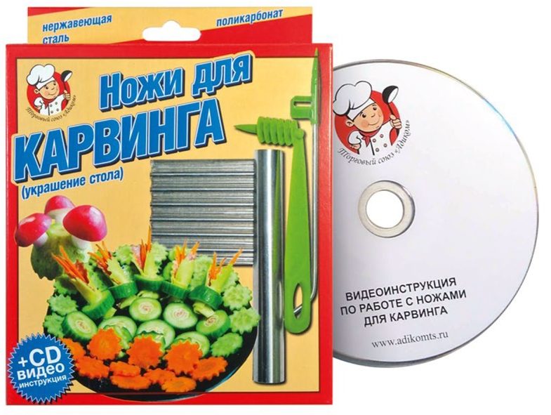 The set of products "Merry Cook" from a Russian manufacturer includes three knives and a disc for work. using these devices, the user will be able to prepare a variety of decorations for dishes. The set includes a decorator knife designed for cutting spirals from oblong-shaped vegetables. Blade for shaped cutting, as well as for removing cores and stuffing.