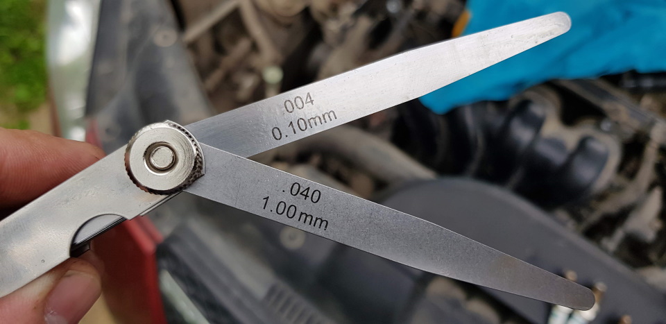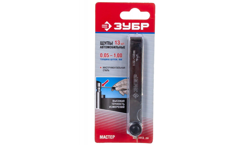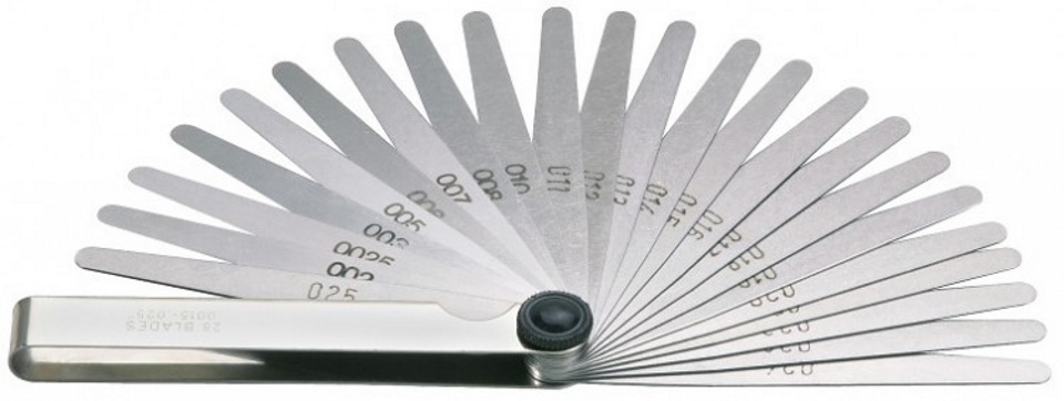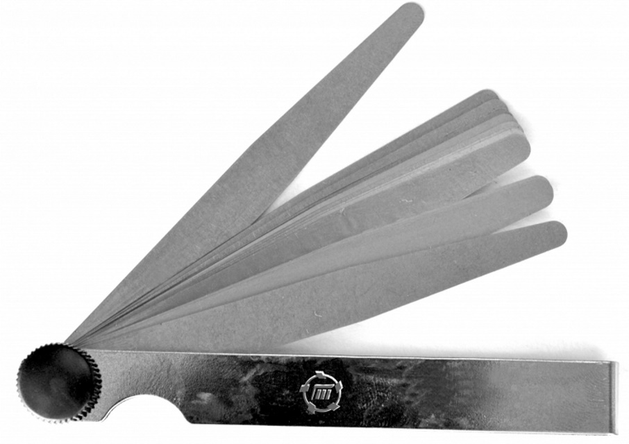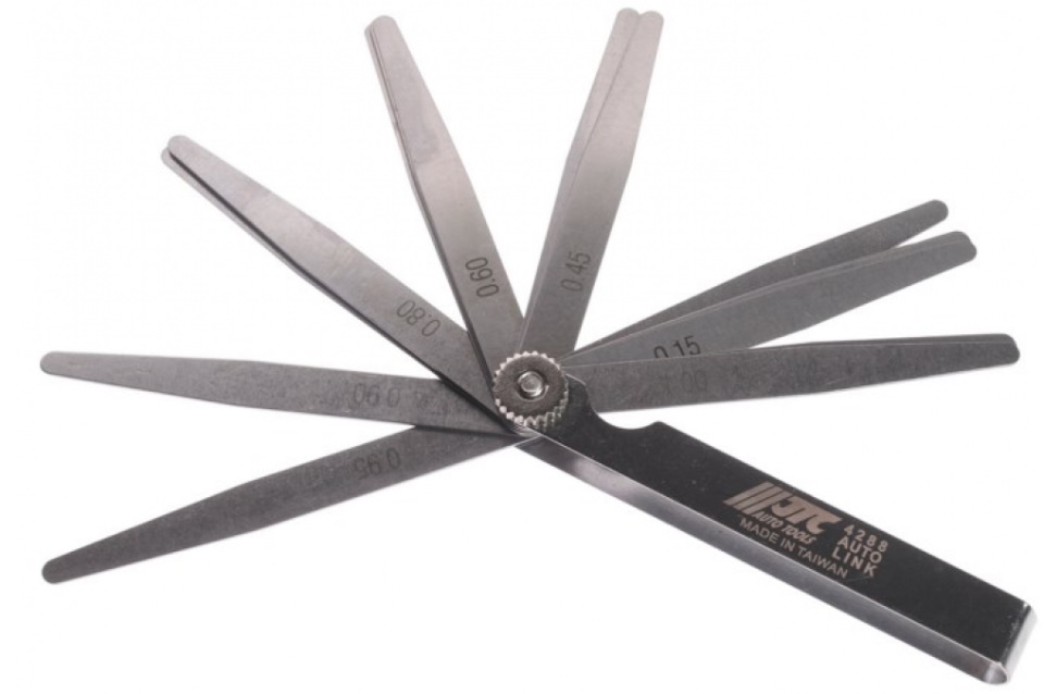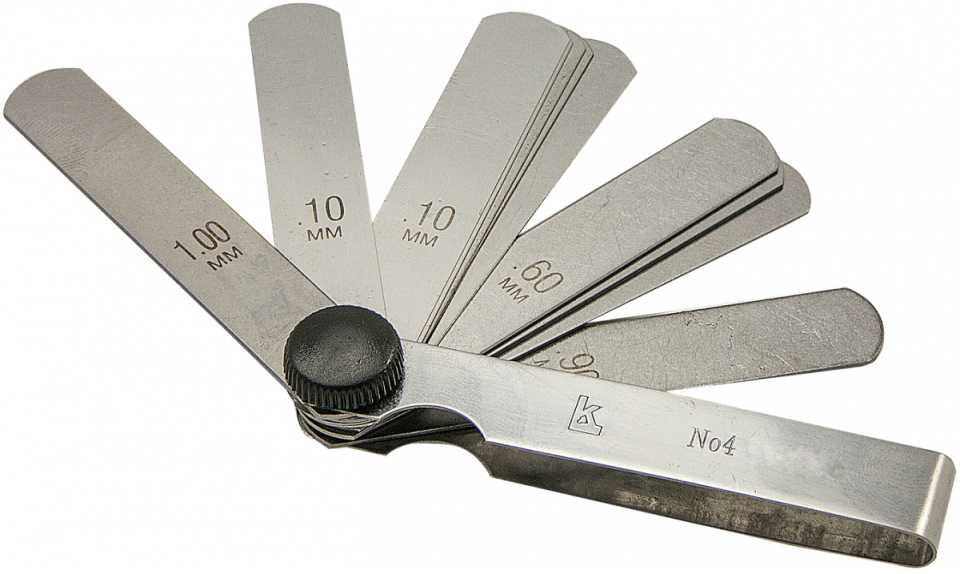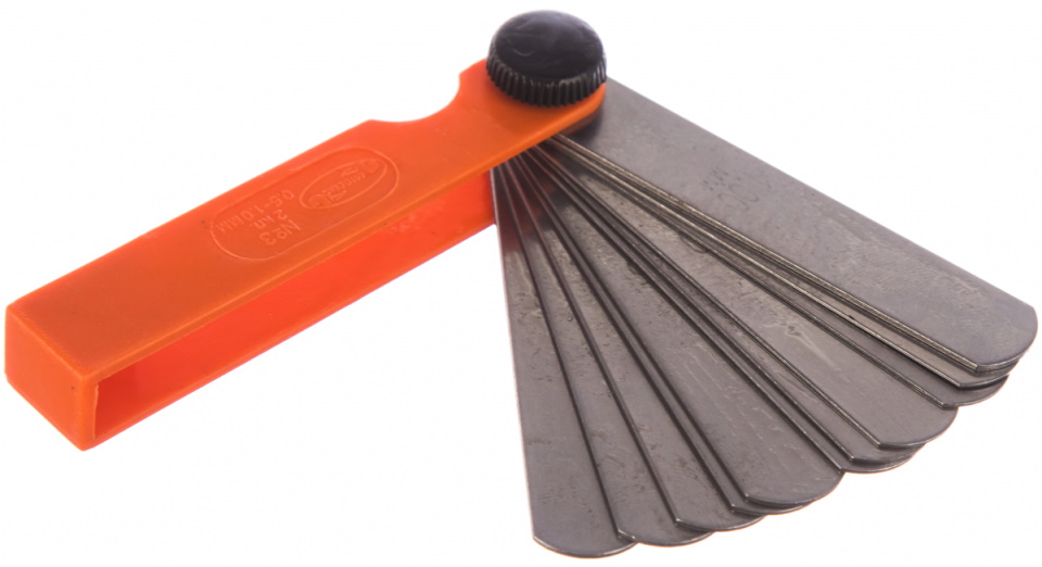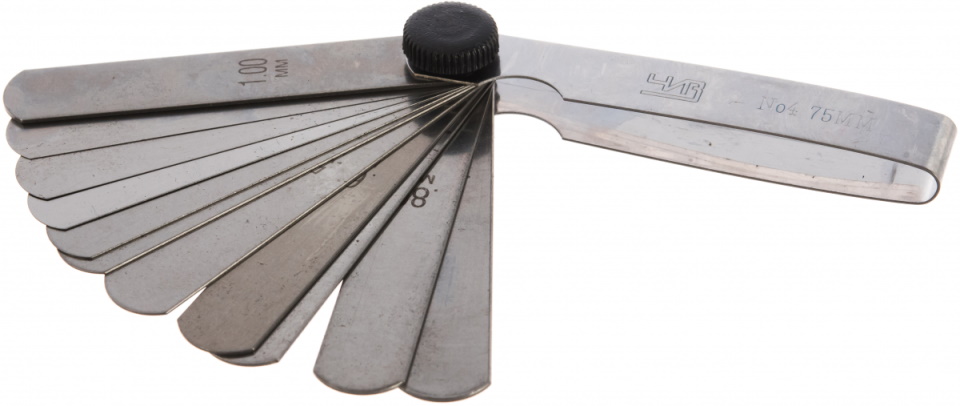 A domestic brand tool for measuring gaps between the surfaces of parts in a car. It is a set of 13 flat polished steel plates 10 centimeters long and 1 cm wide. The range is from 0.05 to 1.0 mm. The weight of the packaged goods is 60 grams.