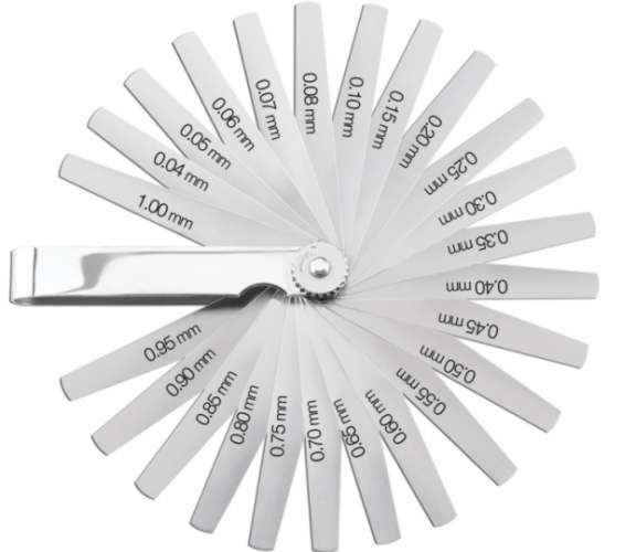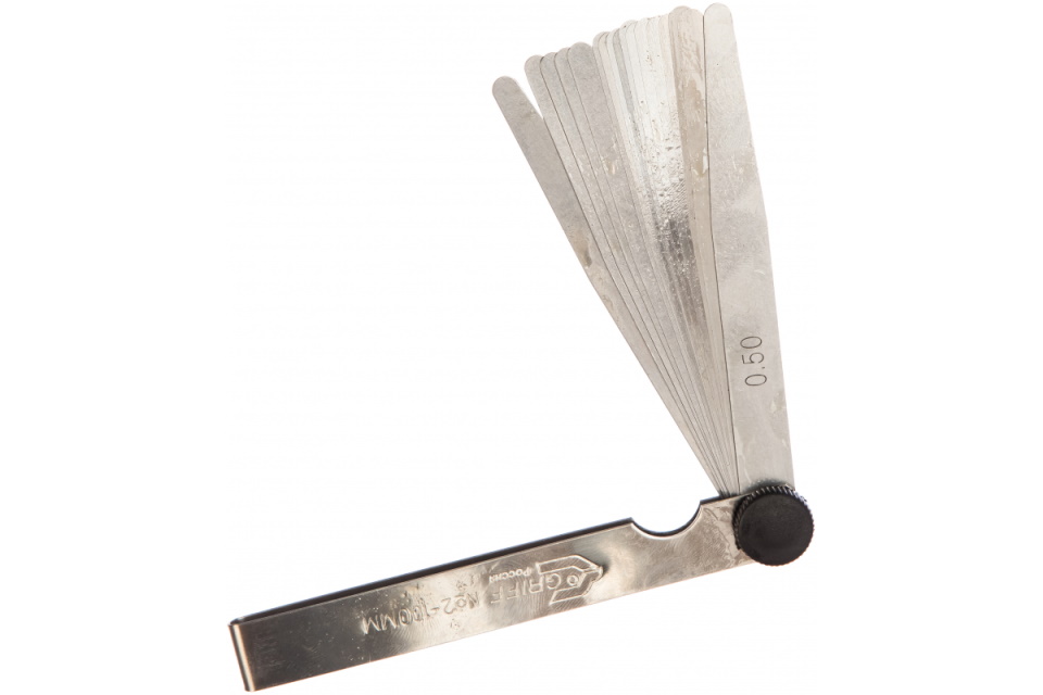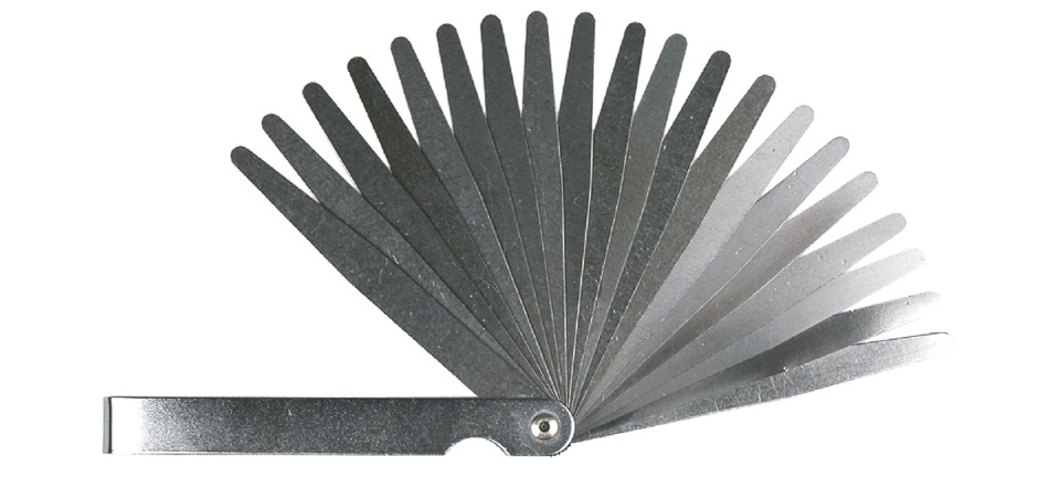 A specialized model of a hand tool for measuring between the surfaces of parts in the repair of motorcycles and vehicles. The set includes 20 thin plates 10 cm long, connected with a reliable lock. If necessary, any element can be removed from the kit and replaced with a new one. Measurements are taken in the range from 0.05 to 1.0 mm. Easy storage and transportation is ensured by the folding design of the product. The weight of the packed goods is 140 grams.