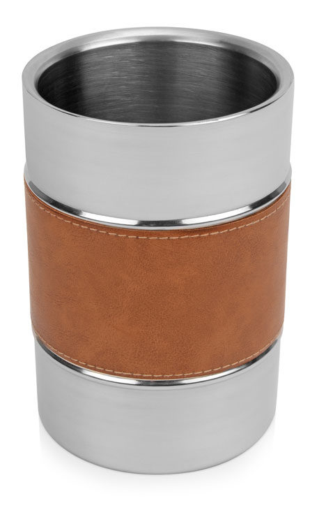 The device, made in the form of a traditional bucket, has a stylish design, thanks to which it looks much more expensive than its true value. It is easy to make a logo on the faux leather insert. The double walls of the bucket will not allow the drink to heat up for a long time. Size - 11.2 x 17.5 cm.