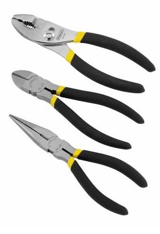 A budget set of pliers and wire cutters suitable for home work, professional use, including contact with thin, medium thickness metal. The kit includes: wire cutters 10 cm x 5 cm x 1 cm; pliers 10 cm x 5.5 cm x 1 cm; pliers with short jaws for clamping, breaking small parts 15 cm x 5 cm x 1 cm. Not suitable for working with live parts.The handle, comfortable to the touch, is covered with black rubber. Price: 919 rubles for 3 items.