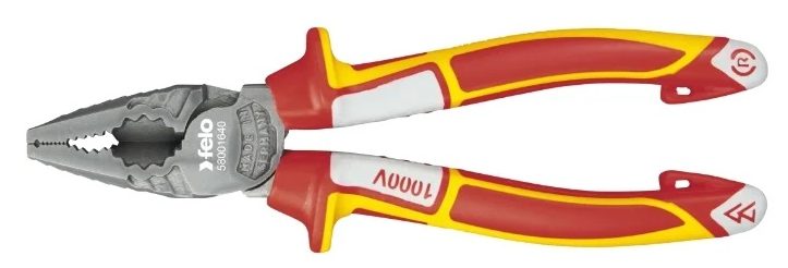 The dielectric pliers of the German manufacturer Felo have chrome-plated handles, which are 16 cm long with sponges. The handles are sheathed multi-component. Reinforced cutting edge allows you to work with round objects, wiring. Excellent workmanship, thick steel, metal is not afraid of water. Not suitable for clamping thin wire, as it has a gap between the jaws of 1 mm. Restriction - 1000 V. Color is bright - red. Price: from 2170 rubles. Available to order online.