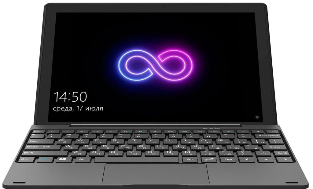 It has a removable QWERTY keyboard, Windows 10 operating system, and simultaneously performs the functions of a tablet and a laptop. There is a plastic case, a keyboard - soft rectangular keys, a touchpad.