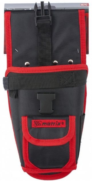 The holster from the Matrix company is designed to store a screwdriver and has separate compartments for replaceable tool elements. The manufacturer made this model as an addition to the main tool belt. Separate compartments for replacement tips are ergonomically designed, so the master will not face the problem of storing replacement equipment. A special buttonhole will allow you to fix the screwdriver most firmly in the holster. The manufacturing material is based on high-density synthetics, so the master can count on a long service life.