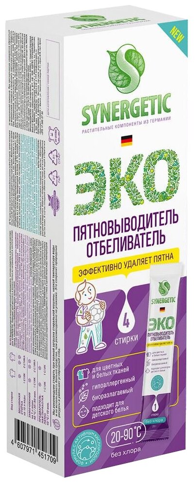 Biodegradable hypoallergenic stain remover in powder form, suitable for cotton and synthetic fabrics, colored and white fabrics, as well as for children's clothes. Efficiency of work is provided by active oxygen and enzymes in the composition. There is no chlorine in the ingredients. It attracts the form factor of the product - sticks, which facilitates the dosing of the stain remover.