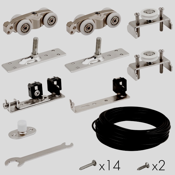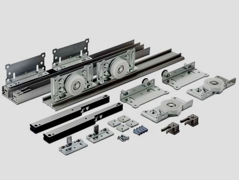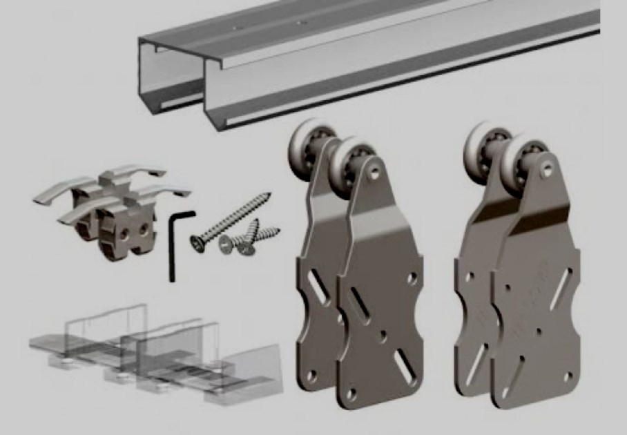The system is designed for the installation of wooden sliding doors weighing up to 80 kg and up to 1 meter wide. Almost all elements are hidden in the canvas itself. Perfect for sophisticated design. Additional milling and preparation of the door leaf is not required. When installing the kit, a free opening is obtained with a width of 96 cm. The kit is equipped with closers on both sides, rollers, a lower closer and guides.