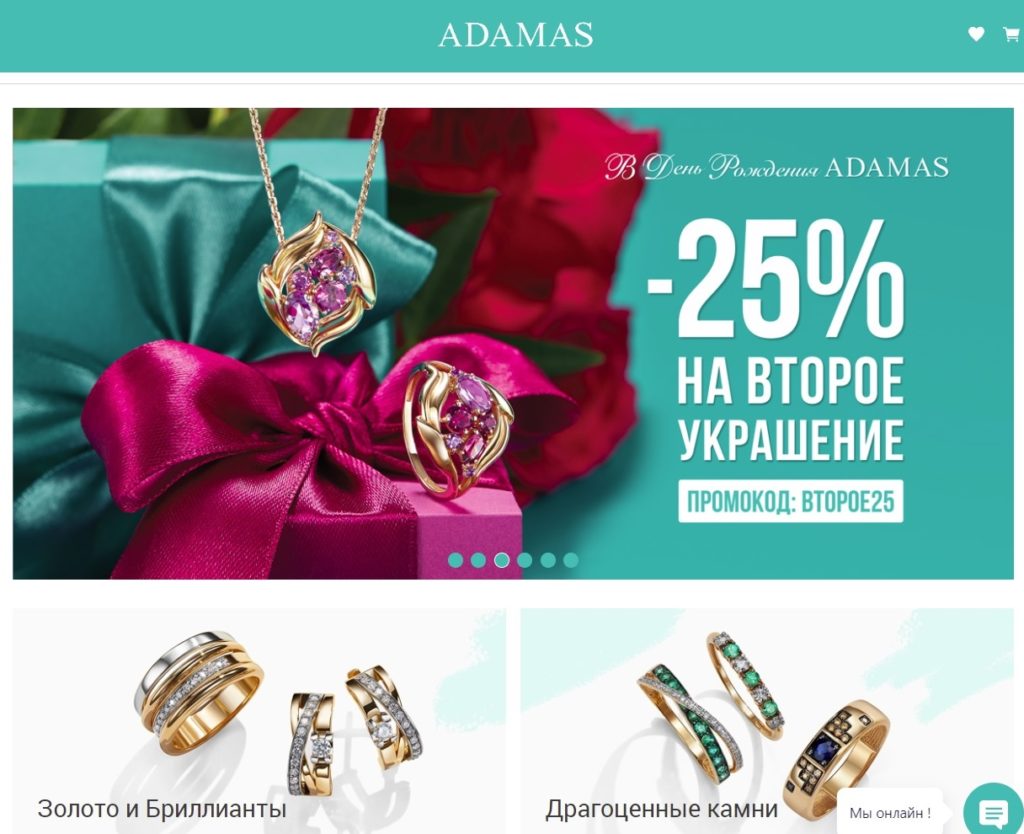 Apple Diamond has an online store with easy navigation and a filter system that allows the user to easily navigate, select and order the product they like. The site provides an opportunity to use the online jewelry designer and create your own unique product with it. In the "SALE" section you can find a 50% discount on rings, earrings, bracelets, pendants and other items. When ordering in the amount of 10,000 rubles. free shipping is provided.