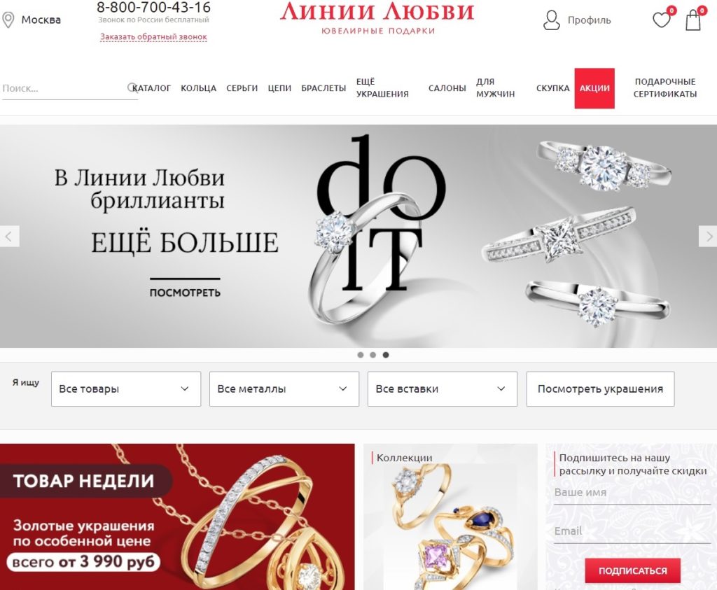 The Lines of Love brand owns more than 130 jewelry stores and salons operating in various Russian cities. The first store was opened in Yaroslavl in 2007, currently the sales network covers more than 60 cities of the country. Collection catalogs from this company include fashion novelties and classic popular products. The advantage of Line of Love products is the ratio of price and quality, as well as traditional and modern fashion trends.