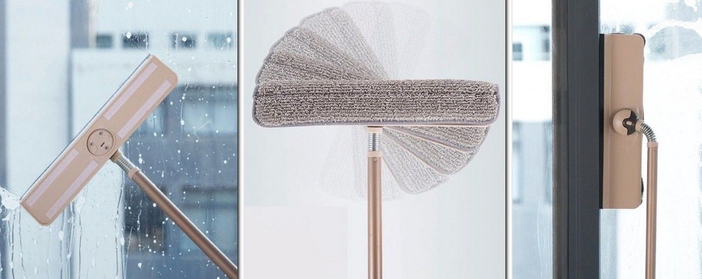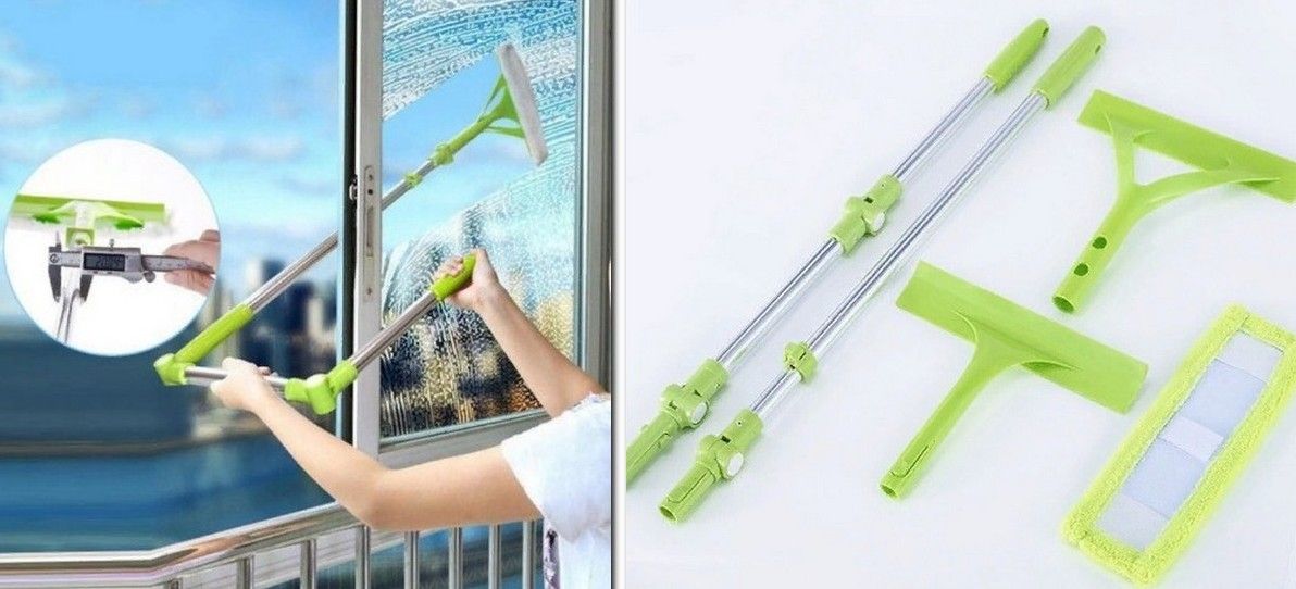 Double-sided cleaning brush for residential premises. Allows you to clean windows, mirrors, floors and ceilings. The telescopic handle is long enough to wash the window from the outside. The flexible frame of the holder and the controllable head quickly cope with dirt in hard-to-reach places.
