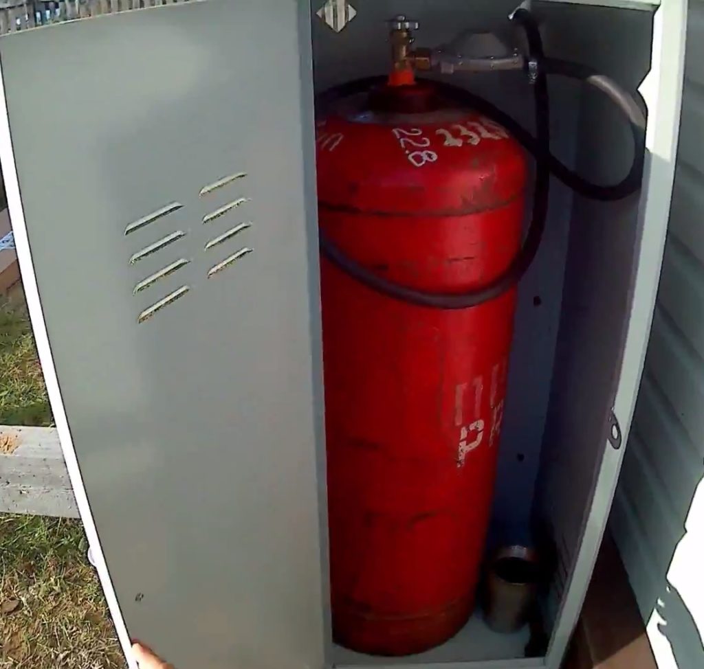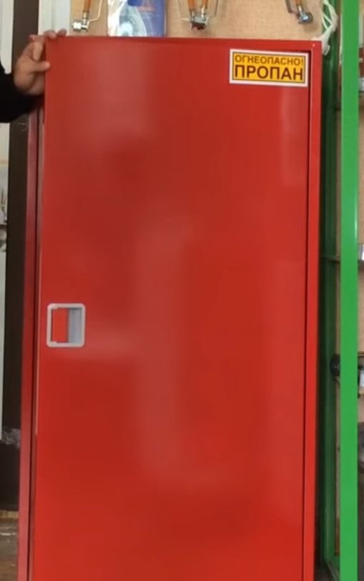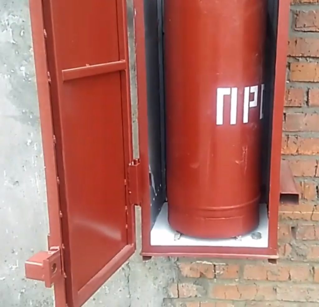 Gas equipment placed in a cabinet is protected from adverse weather conditions, exposure to sunlight, which allows the cylinders not to overheat. The door is equipped with reinforced hinges, fastenings for a padlock, on which, in order to preserve property, it is hung.