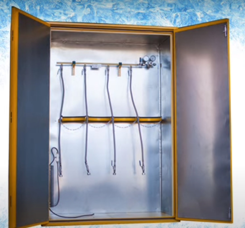 It is important to mention what colors the cabinets come in, as they are often the same color as the cylinders, oxygen is blue, helium is brown, and so on. Hazard warning signs are placed in a conspicuous place. Check if the product has stiffeners that fix the structure.