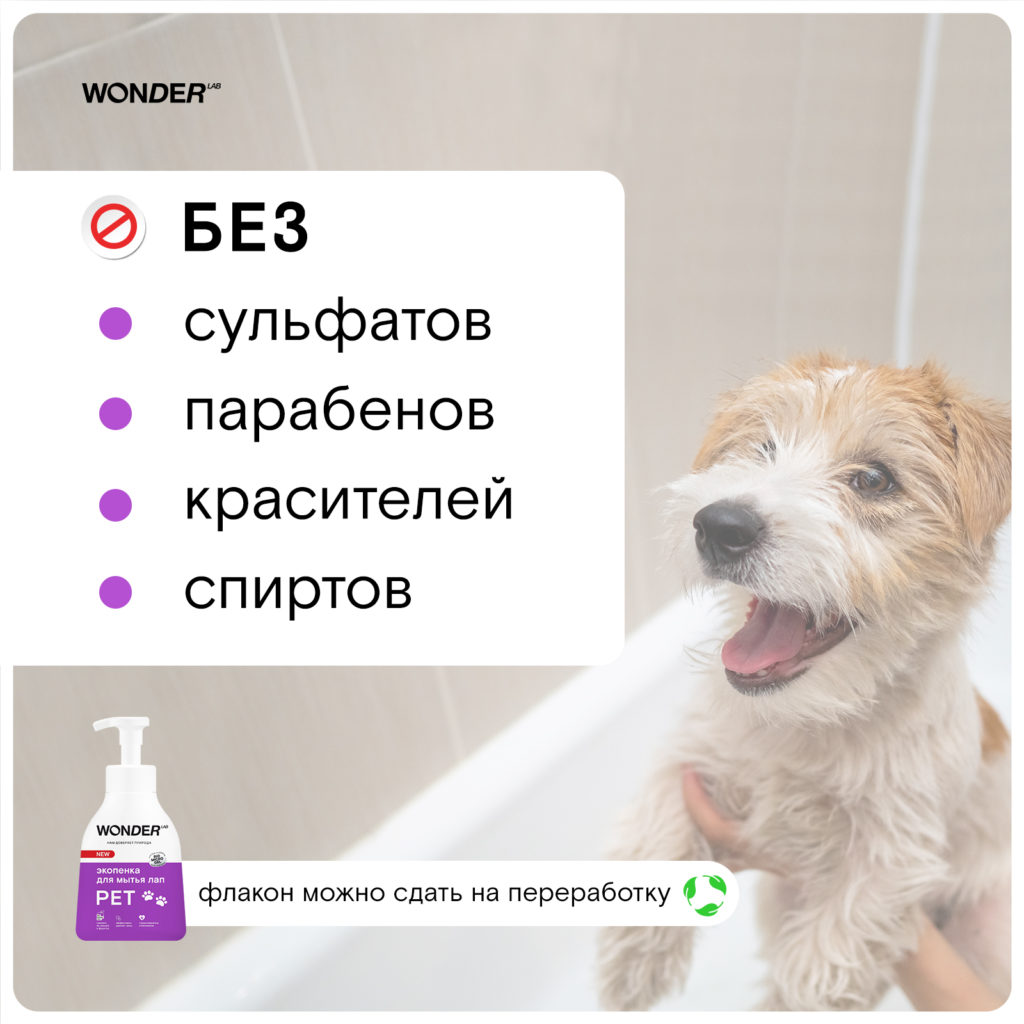 WONDER LAB Post Walk Dog Paw Shampoo cleans your pet's paws from dirt, reagents and other traces of walking. It does not have a specific smell, and it is also perfectly washed off the coat, so it is safe for the dog to lick. The product comes in a very practical form factor - foam - so it is easy to apply, allowing you to thoroughly rinse the pads, claws and hair between the paws. The shampoo contains no dangerous components, so it does not provoke irritation of the skin and does not overdry it.