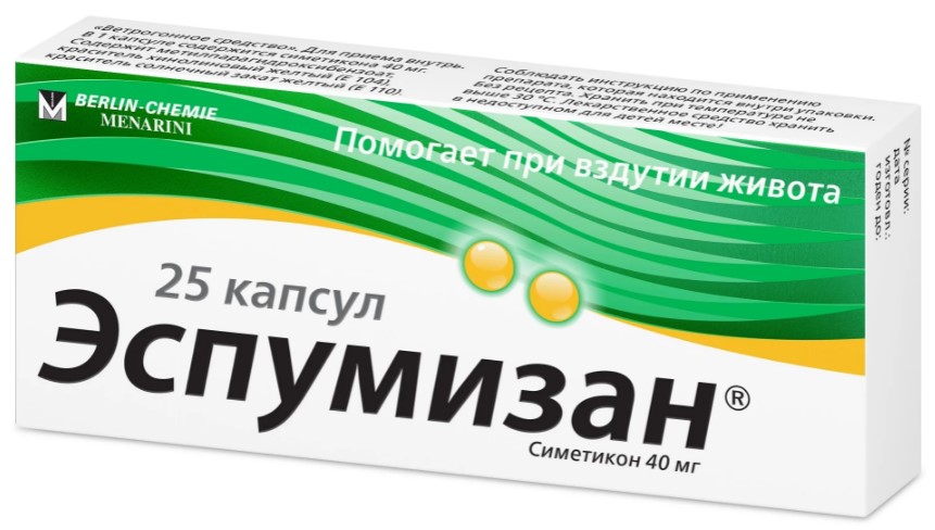 Defoamer. The active substance - simethicone, is chemically inert, is not absorbed into the blood, does not remove minerals, vitamins with prolonged use. It is prescribed for flatulence, poisoning with detergents, before examination of internal organs (X-ray, ultrasound). Release form - capsules, emulsion, sachets, drops (for children). Producer - Berlin-Chemie / Menarini, Germany. Cost - from 295 rubles. (25 capsules) up to 561 rubles. (drops 50 ml).