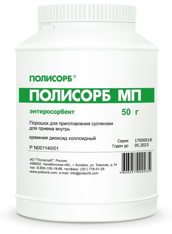 Enterosorbent. The active substance is colloidal silicon dioxide. Assign for diarrhea, intoxication of adults and children, allergic, dermatological manifestations. Produced in the form of a powder for the preparation of a suspension, in vials and sachets. The required amount of powder depends on body weight. Producer - Polysorb MP, Russia. Cost - from 165 rubles. (bottle 12 g) up to 377 rubles. (bank 50 g).
