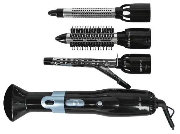 It costs 2900 rubles. There is a power indicator, the cord rotates, a loop for hanging. There are seven nozzles, ceramic coating. The set includes a brush, curling tongs, corrugation, spiral styling, straightening.