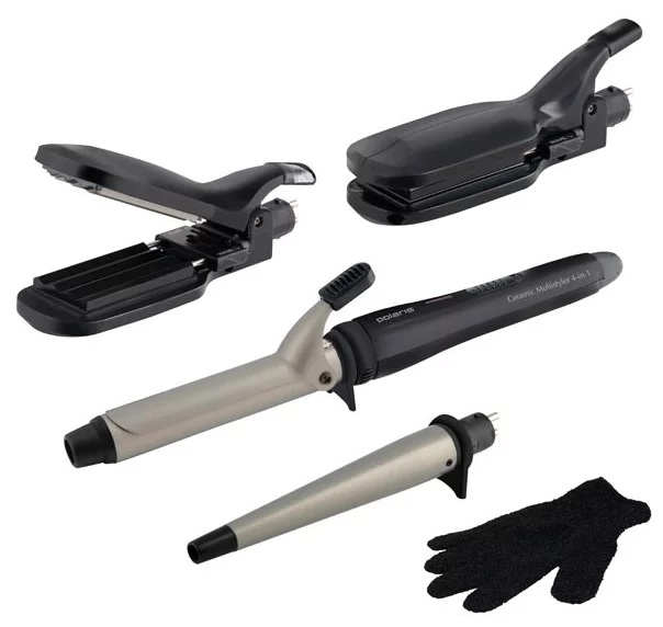 Price: 3499 rubles. The multi-styler with conical tongs with a power of 50 W heats up to a temperature of 200 degrees. There is an indication of switching on, there is a loop for hanging. The device is protected from overheating, the cord rotates. In addition to a conical, 13-25 mm nozzle, you can attach a 25 mm curling nozzle, 35x70 mm for straightening, the same size corrugation. Comes with a protective glove. The coating is ceramic.