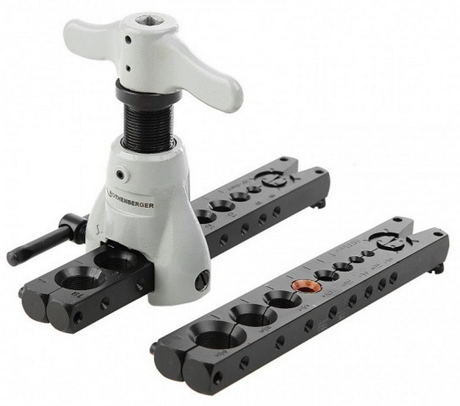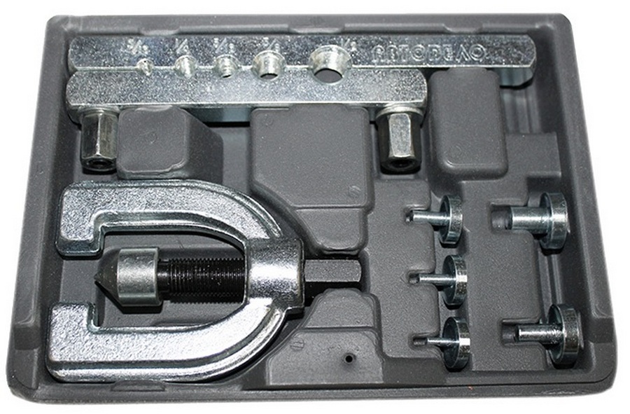 A unique flaring kit for any plumber who is focused on cold flaring soft material tubing. Contains a complete set of tools needed to perform all rolling steps. There is a scraper for removing burrs from the side of the inner edge, the head with a nozzle works on the eccentric principle, both inch and metric systems are used in the matrix. It will be an excellent acquisition not only for service station employees, but also for specialists in the installation of refrigeration and pneumatic equipment.
