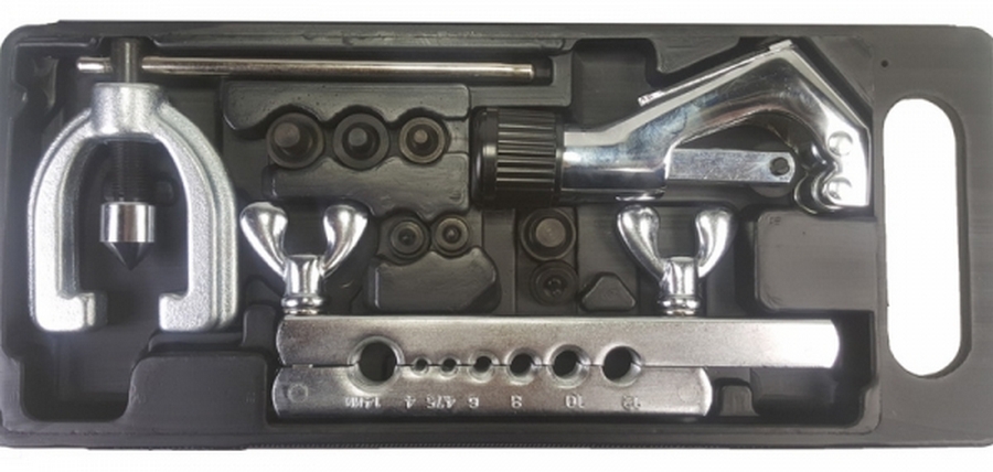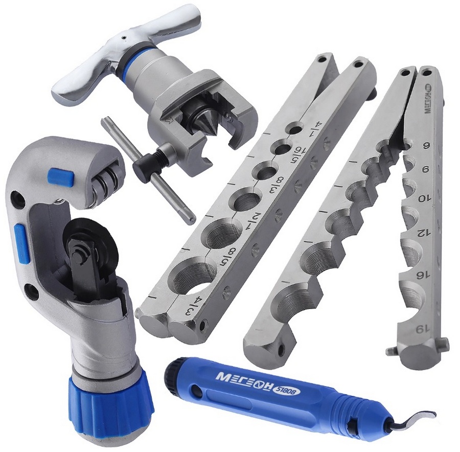 Great kit for flaring/cutting pipes. All fixtures are made of high quality alloy steel, characterized by increased wear resistance, work on most non-ferrous metals. Adapters are available for all common sizes (including 5/16) and comes with a spare blade. The edges do not jam, the result is very neat.