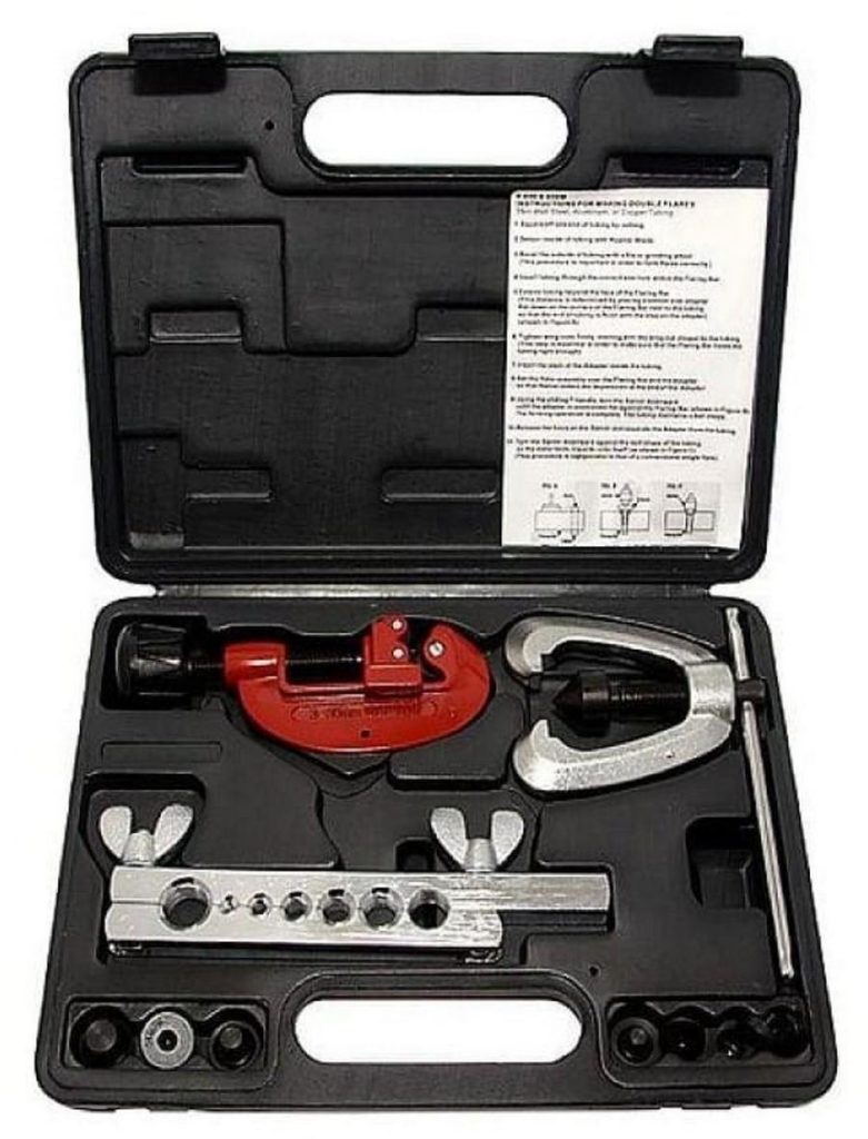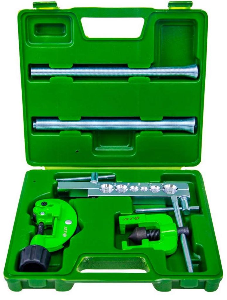 The set is specially focused on flaring brake pipes. The toolkit works great with stainless steel, copper, aluminum and brass. The kit includes a handy case and a pipe cutter with a flaring tool. The knife disk is characterized by a special hardness, however, it requires the most thorough cleaning after each use. The vise securely holds the workpiece.