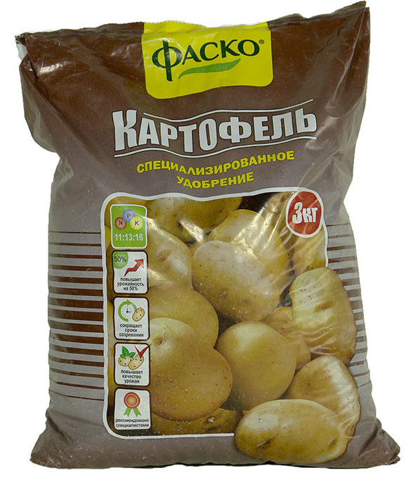 A complex product in the form of granules, produced by the Russian company Fertika. Contains phosphorus, potassium, nitrogen and a complex of microelements - sulfur, boron, copper, etc. There is no chlorine in the product. It is introduced into the soil in spring (when preparing the site, before planting potatoes, during the growing season). After applying the product, the formation and growth of tubers is enhanced.
