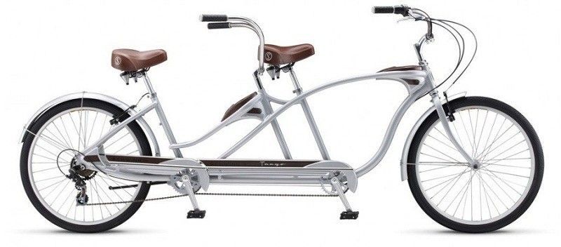 Tandem is an interesting model for leisurely bike rides for two (sometimes three). At the same time, each cyclist has the opportunity to pedal thanks to a separate drive system. There are two (three) saddles, a long frame, no shock absorbers. Tandems can be walking, mountain or road.