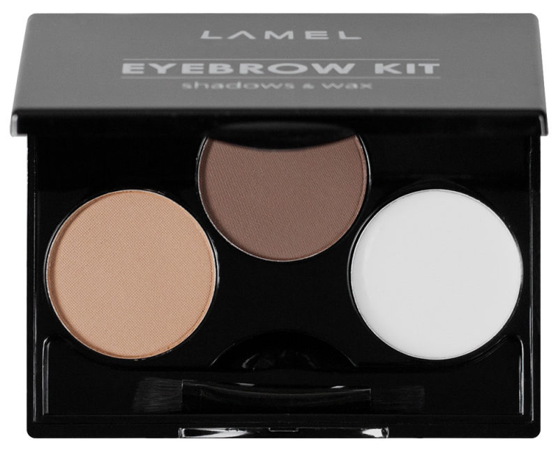 For 350 rubles, on average, not a separate wax of a colorless texture or a certain color is purchased, but a set at once. Here are the eyebrow shadows of three shades, and with them colorless wax. The kit comes with a convenient brush - applicator for applying the contents of the set.
