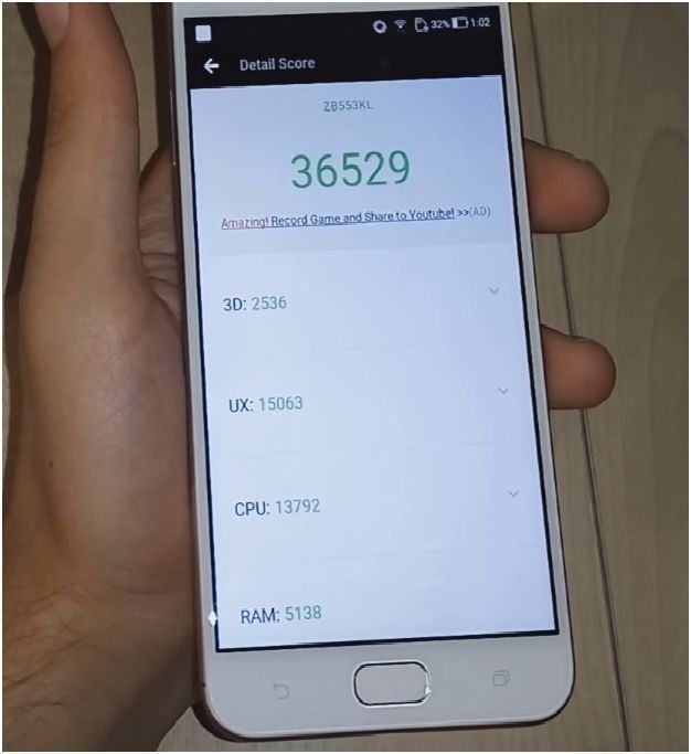 The Antutu score of 36,500+/-100 points is a poor result when looking at it in 2018 at this price point. In simple terms, it is enough just to sit in the social. networks, in Youtube - watch videos, stick to light games and that's it.