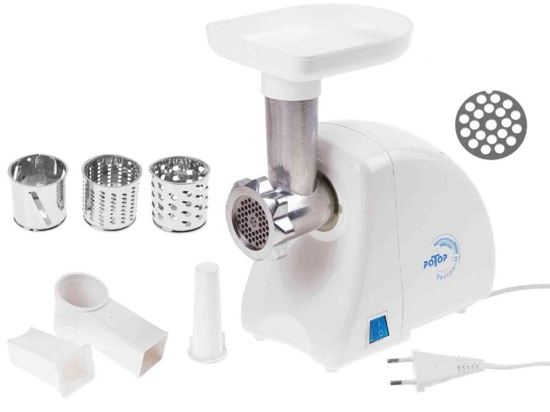 A total of 7 nozzles are included (3 for minced meat, 3 for grater, 1 for shredding). The power indicator of the device is 500-1600 watts. Productivity - 1.9 kg / min.