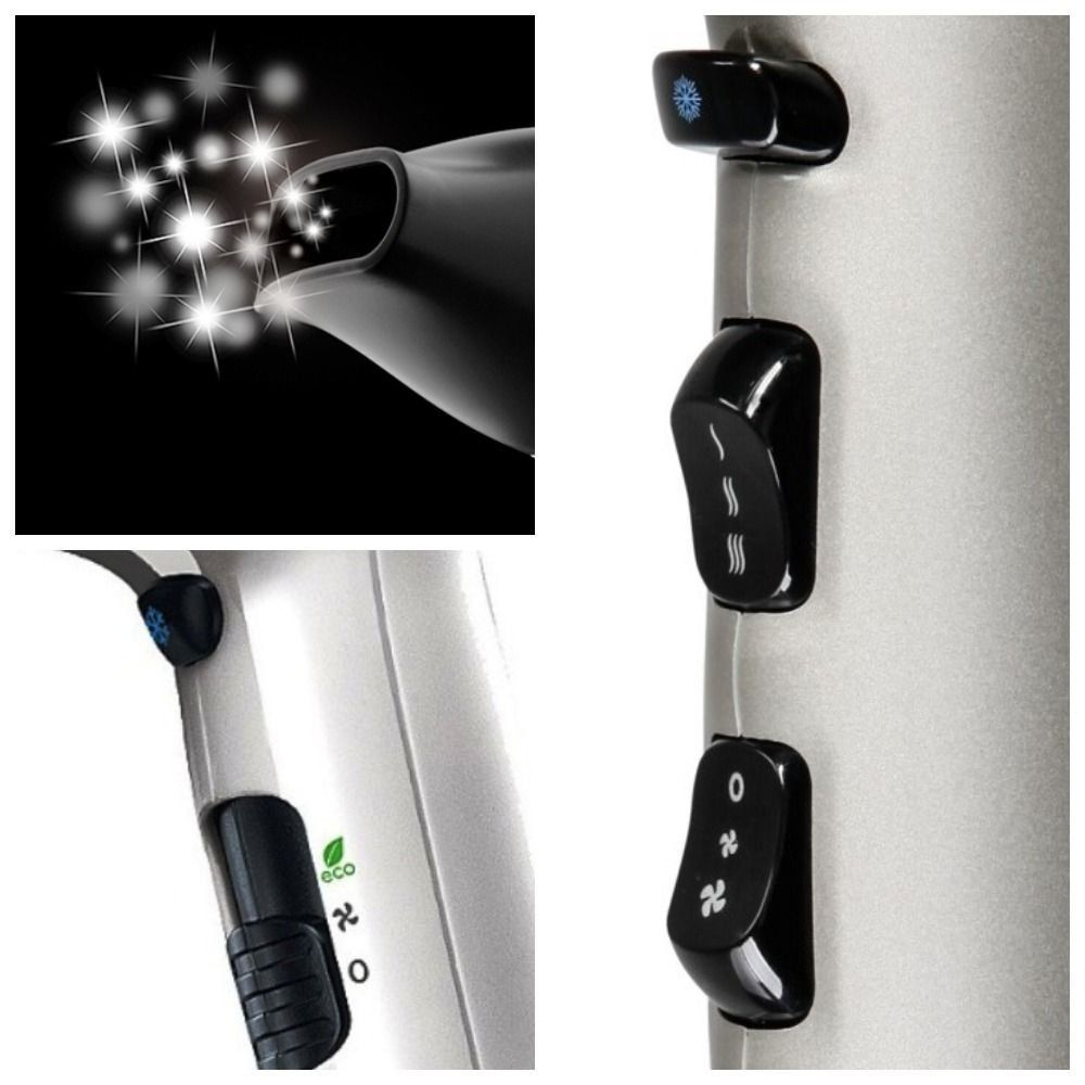L'aspect spectaculaire du produit le rend particulièrement attractif. Design moderne, confort maximal lors de l'utilisation, contrôle facile de la situation. Le boîtier a un rétroéclairage pour indiquer le flux froid et chaud. Les jets d'air 3D assurent un flux continu. La forme du corps minimise les turbulences à la base, ce qui contribue à un travail rapide et de qualité sur la coiffure.