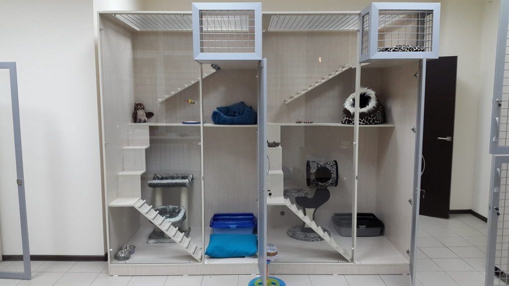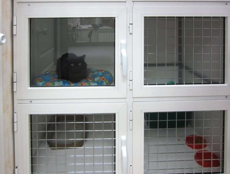 Hôtel à la clinique vétérinaire. Il peut être laissé pour la garde temporaire de chats, hamsters, cobayes. Pour l'hébergement des animaux, des modules sont proposés à partir de huit sections. Les cloisons sont interlatérales et entre les niveaux sont supprimées, transformant la pièce. Au niveau inférieur, il y a un bol pour la nourriture et un plateau, au niveau supérieur, il y a un endroit pour se reposer. Le sol est en carrelage et les murs en enduit de lavage décoratif. Les animaux sont examinés quotidiennement par un vétérinaire, les chambres sont nettoyées deux fois par jour. Tailles et prix des boîtes :