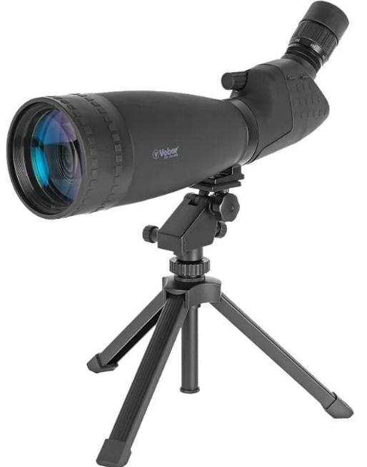 La longue-vue avec possibilité de montage sur un trépied (inclus, bureau en métal) d'une longueur de 27,3 cm et d'un poids net de 510 g est équipée d'un objectif de 60 mm avec une rupture d'axe optique de 45 degrés, ce qui donne un grossissement de 12-36x.