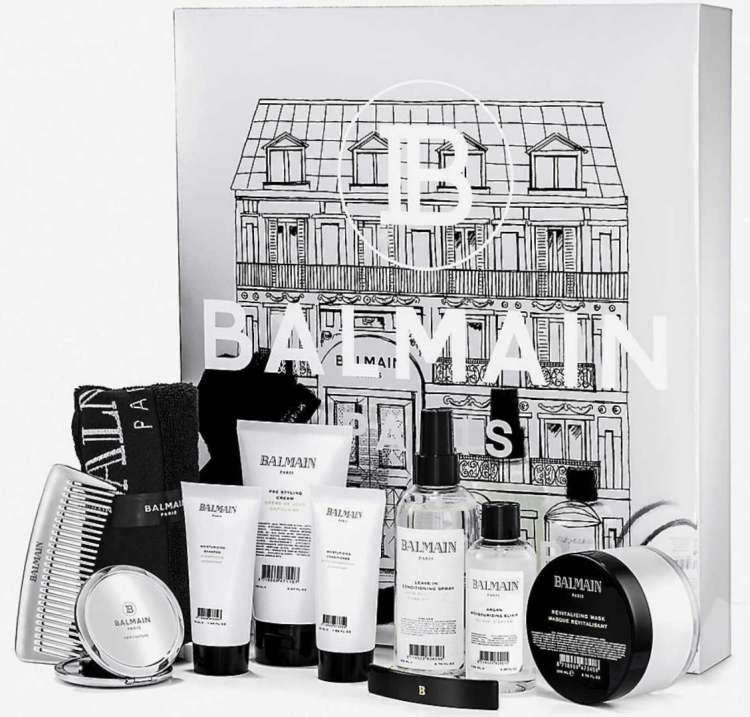 Un packaging hors-norme, visualisé sous la Maison de Couture, comprend 10 unités de produits nécessaires à un soin capillaire complet : shampoing, après-shampooing, masque, élixir, spray, crème coiffante, ainsi qu'un petit peigne, mini-miroir, serviette et épingle à cheveux de marque .