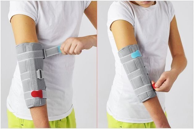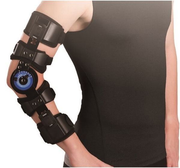 Ces dispositifs sont classés comme des orthèses, mais dans certains cas, ils peuvent être utilisés pour résoudre d'autres problèmes. L'attelle appliquée au coude couvre en outre une grande surface sur l'épaule et l'avant-bras. Le produit comporte également des nervures rigides verrouillables et un manchon de membre extensible. Il existe également un dispositif de fixation pivotant, qui vous permet de définir l'amplitude du mouvement possible.Pour qu'une personne ne crée pas d'efforts pour tenir le bras sous une forme pliée, une ceinture est fournie qui est jetée sur l'épaule. Les traumatologues prescrivent le port d'un appareil orthodontique en remplacement d'un plâtre et d'un bandage mouchoir.