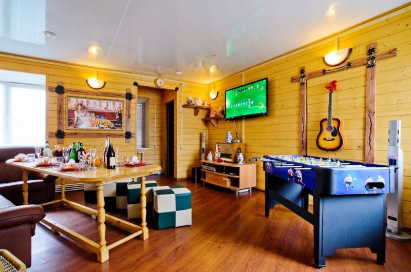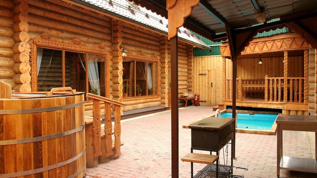Ce complexe de bains se compose de plusieurs cabanes en rondins sur deux étages. Chacun d'eux peut accueillir jusqu'à 20 personnes en même temps. Chaque maison est décorée dans un style thématique individuel. Ils ont plusieurs salles où vous pouvez non seulement prendre un bain de vapeur dans un bon russe, mais aussi vous asseoir près de la cheminée, chanter au karaoké, jouer au billard. Chaque chalet a sa propre cour avec une piscine.