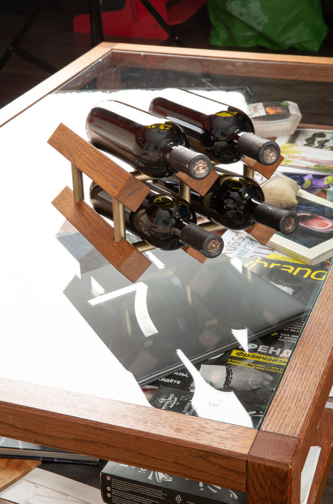 Le produit domestique du bureau d'art Wood4Wine à Moscou est en bois de chêne naturel et est conçu pour stocker quatre bouteilles de vin en position horizontale.Les poutres en bois de ce modèle sont combinées avec des tubes métalliques en laiton, ce qui rend le design original et beau. La solidité, la durabilité et la résistance aux contraintes mécaniques sur toutes les surfaces du produit sont assurées par leur traitement, qui se compose de six étapes. Ils comprennent le meulage obligatoire, l'imprégnation des pièces en bois avec des huiles de haute qualité, le polissage et le revêtement avec un vernis de finition. Le fabricant accorde une attention particulière à l'exclusivité des produits fabriqués exclusivement à la main. Par conséquent, lors de l'achat d'un produit Wood4Wine, vous pouvez être sûr qu'il n'aura pas d'analogue exact.