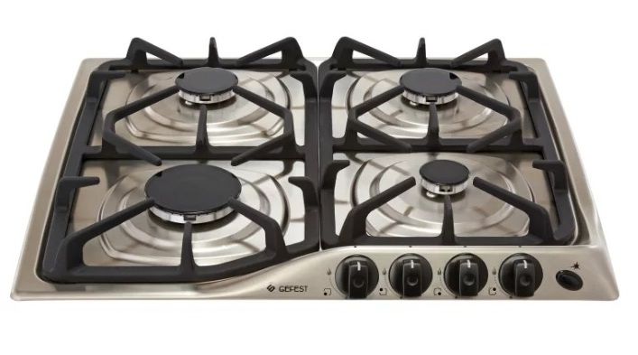 Plaque de cuisson à gaz 4 feux en acier inoxydable. Le corps de l'équipement est en argent, en raison de sa propriété, il est facilement nettoyé de la saleté.