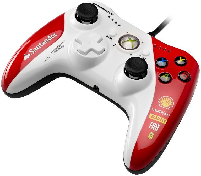 Le modèle Thrustmaster GPX LightBack Ferrari F1 Edition ressemble aux contrôleurs Xbox 360, mais avec des innovations importantes et quelques fonctionnalités. Au centre du panneau se trouvent les boutons de menu, les touches "retour" et "démarrer". Les sticks analogiques sur le dessus s'allument lorsque les gâchettes sont enfoncées.