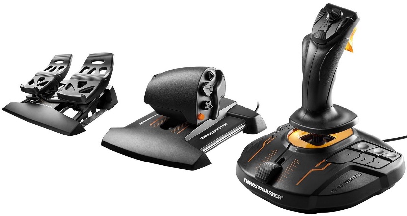 Le forfait comprend : 2 pédales Thrustmaster Flight Rudder, le levier de commande Thrustmaster Weapon Control System et le joystick Flight Control System lui-même.
