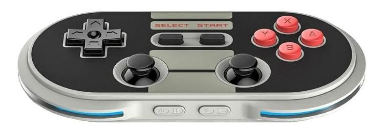 La manette sans fil de forme ovale convient à de nombreux appareils (y compris les ordinateurs personnels) prenant en charge les systèmes iOS, Mac et Android. Il est équipé de sa propre batterie, dispose de deux mini-joysticks, de 4 modes et d'un D-pad. Le boîtier est fabriqué dans un style rétro avec rétro-éclairage.