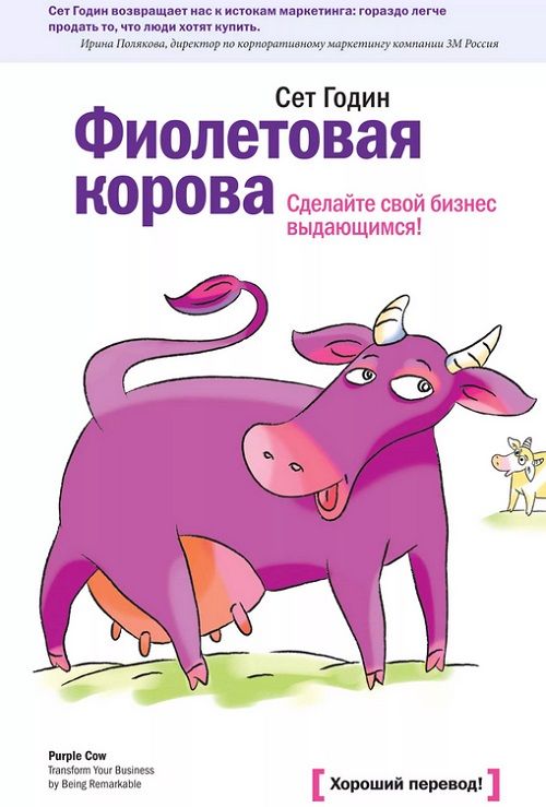 Et le dernier livre de notre classement des livres de qualité pour les spécialistes du marketing est Purple Cow du gourou du marketing américain Seth Godin. Le titre est très original et son essence se révèle au cours de la lecture, car l'auteur parle de biens inhabituels et de services exceptionnels. Il y a deux idées maîtresses dans le livre : la vache violette attire toujours l'attention, et pour en devenir une, il faut être un joli casse-cou.Il n'y a pas de recommandations universelles concernant la création d'une "vache violette", mais il existe un système d'auteur qui vous permet de vous rapprocher de cette formulation. Le livre est attrayant parce qu'il contient un nombre suffisant d'exemples frappants. De plus, le langage facile de la narration capte le lecteur dès les premières lignes.