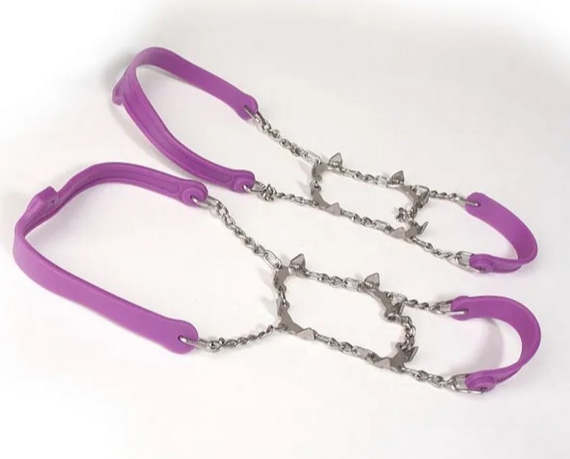 Les accès à glace universels sont fournis dans un sac, ont 8 pointes, conçus pour marcher en toute sécurité sur la neige et la glace. Il existe des dispositifs pour chaussures homme et femme, pour des chaussures de tailles différentes. Les lilas sont mis sur les tailles 36-40, les noirs - 40-45. Parfait pour les amateurs de tourisme et de randonnées en montagne, les grimpeurs qui savent ce qui menace une chute infructueuse, ainsi que les pêcheurs et les chasseurs qui passent beaucoup de temps dans des conditions extrêmes. Les pointes ne sont pas recommandées pour les équipements sportifs ou de protection individuelle. Le coût recommandé pour les chaînes de magasins est de 1100 roubles.