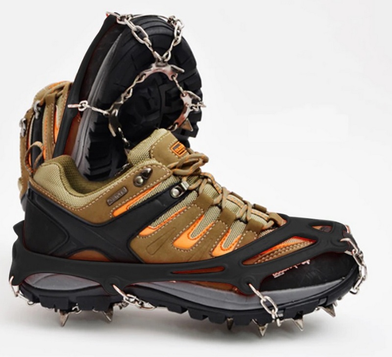 Le deuxième élément de l'accès à la glace est les crampons. Ils doivent être fabriqués en acier de haute qualité et solidement rivetés à la base. Le collage, pour des raisons évidentes, est inacceptable. Le nombre minimum de pointes sur un accès à la glace est de 6. Plus il y en a, plus le patin antidérapant adhère de manière fiable à la surface glacée. La hauteur de la pointe varie généralement entre 3 et 5 millimètres, bien qu'il existe des modèles avec des dents en acier d'un centimètre. Mais il n'est pas nécessaire d'en acheter pour faire de la randonnée dans le chalet d'été ou dans les rues de la ville. Les accès à glace "Toothy" sont conçus pour les déplacements extrêmes. D'autre part, il existe des spécimens qui n'ont pas de pointes du tout. Une couche de papier de verre avec un gros grain abrasif est responsable des propriétés antidérapantes. La qualité de leur protection contre les chutes est un sujet de débat.Mais le fait que ces appareils s'usent beaucoup plus rapidement que les cloutés peut être dit avec certitude.