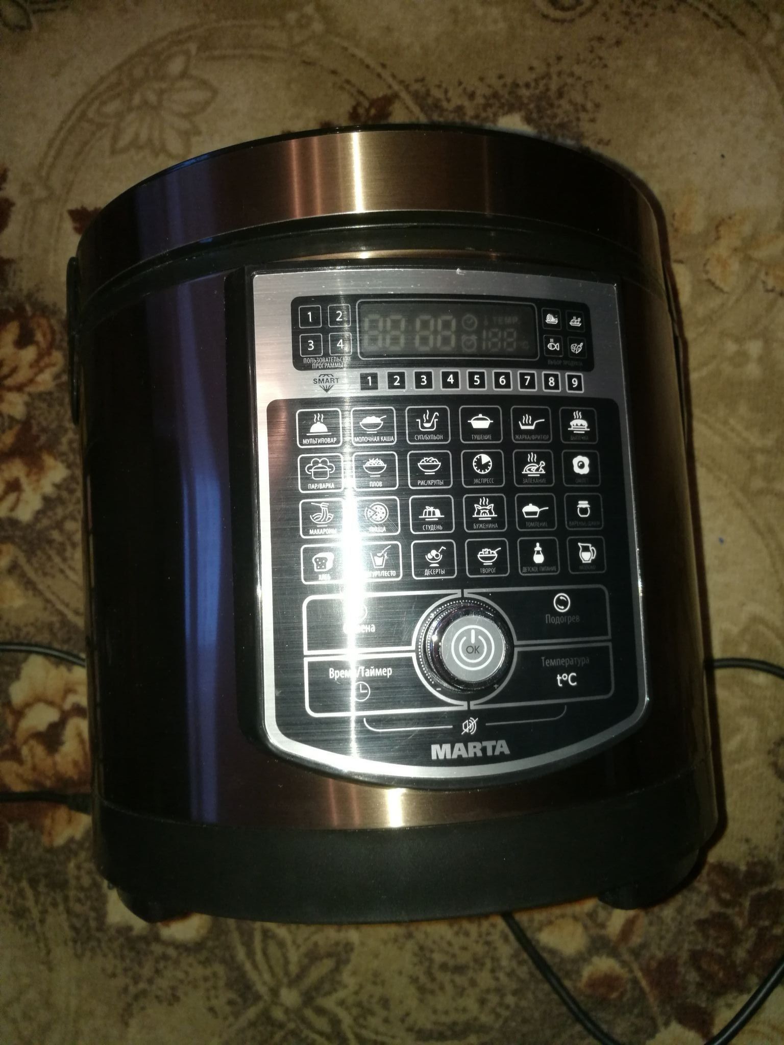 Certainement, acheter un multicuiseur Marta sera un bon choix. La présence d'un large éventail de programmes, la plupart d'entre eux peuvent être ajustés indépendamment. Le modèle combiné du multicuiseur avec un autocuiseur en mode autocuiseur cuit à très grande vitesse. Un assistant indispensable pour les ménagères, et pas seulement pour les ménagères.