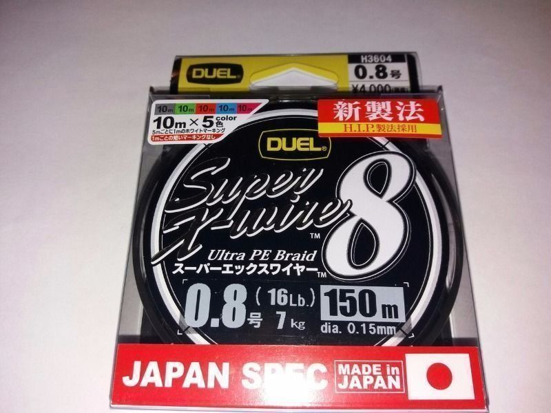 Parmi les cordons de classe premium, il convient de noter le modèle Duel PE SUPER X-WIRE 8 (150 m), fabriqué dans une version à huit conducteurs. La tresse a une fiabilité et une résistance élevées et résiste à l'abrasion. Le produit lui-même est assez élastique et possède un revêtement spécial qui résiste à l'humidité et aux frottements. La charge de rupture est de 9 kg, diamètre 0,17 mm, déroulement 150 m. L'élasticité est élevée, la résistance à l'usure est décente.