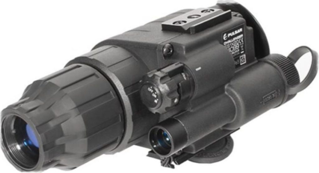 La lueur du tube intensificateur d'image est masquée par un œilleton en caoutchouc souple. Le monoculaire a un éclairage IR grand angle, ce qui vous permet d'utiliser l'appareil avec un masque. Vous pouvez attacher un appareil de vision nocturne à l'œil gauche et à l'œil droit. Deux attaches avec une douille de ¼ de pouce de diamètre sont situées diamétralement.